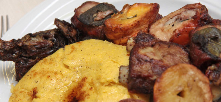 Lo spiedo viene servito con la polenta bresciana e il suo intingolo.